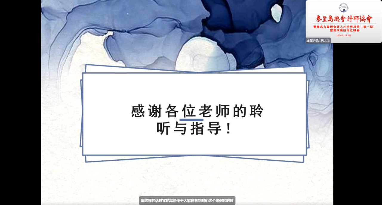 通过本期督导汇报,十分欣慰看到各位学员取得的成绩和进步,学员在汇报时也一再感谢各位导师的精心指导和培养。秦皇岛市管理会计人才培养项目目标是推动管理会计工作更好地服务于我市经济高质量发展,促进企业创新创值和产业转型,提高行政事业单位管理绩效和公共管理服务水平。本次案例成果阶段汇报,大部分学员的案例成果质量较高,得到了与会导师的肯定,会后要求各位同学后续按照指导意见,抓紧完善,确保在12月底前达到考核方案验收标准,达到公开推广要求,按时高标准完成成果!